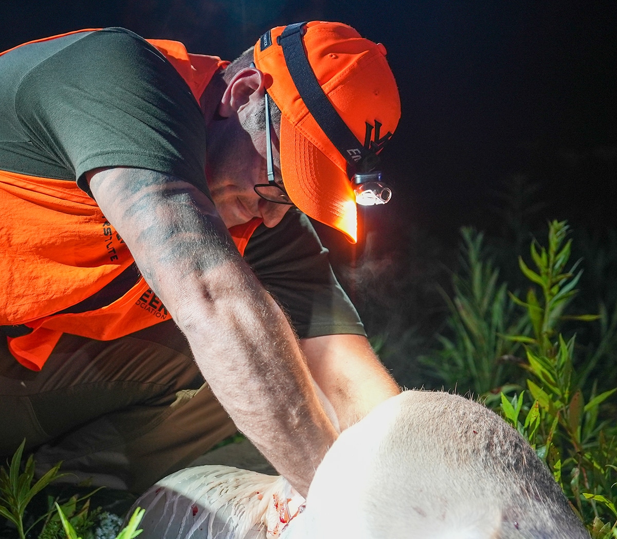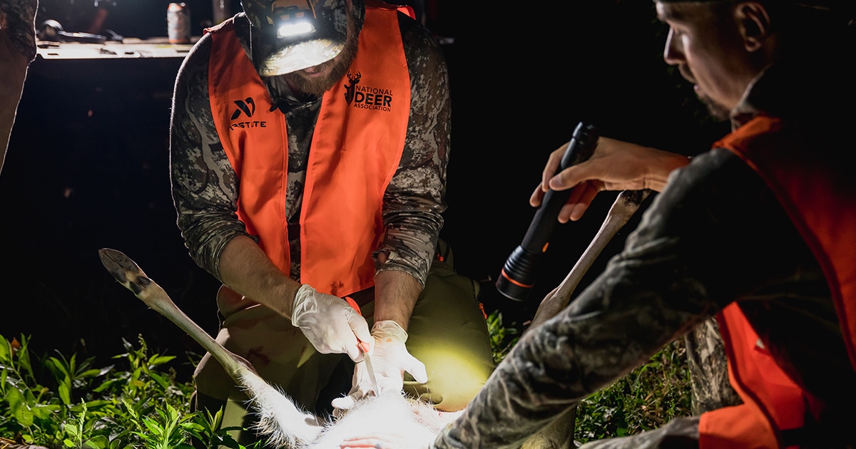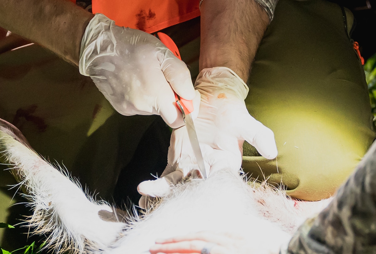 Of course, in some cases you may have already ruptured the rumen with less-than-ideal shot placement. Even a lethal lung shot that’s a little far back can rupture the upper part of the digestive tract. Do your best to field-dress the deer while minimizing contact between meat and rumen contents. If you can, hanging a gut-shot deer by the hind legs is best, because most of the meat will be above instead of below the organs. Keep the hide on the deer to cover as much meat as possible until you clean up any rumen contents. Don’t forget to change gloves and wash your knife, or switch to a clean one, before proceeding to cutting meat.