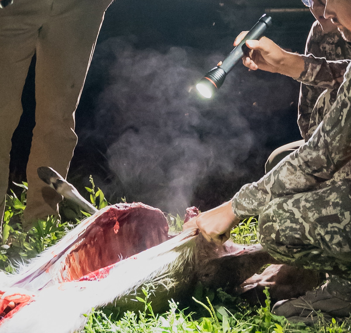 You don’t have to own multiple knives. A single knife can do the job, but please clean your blade regularly throughout the process. For the love of steak, don’t cut out the backstraps with an unwashed blade that just sliced through the intestines. Wash with soap and water or, if you’re out in the woods, use those scent-free wipes in your pack.