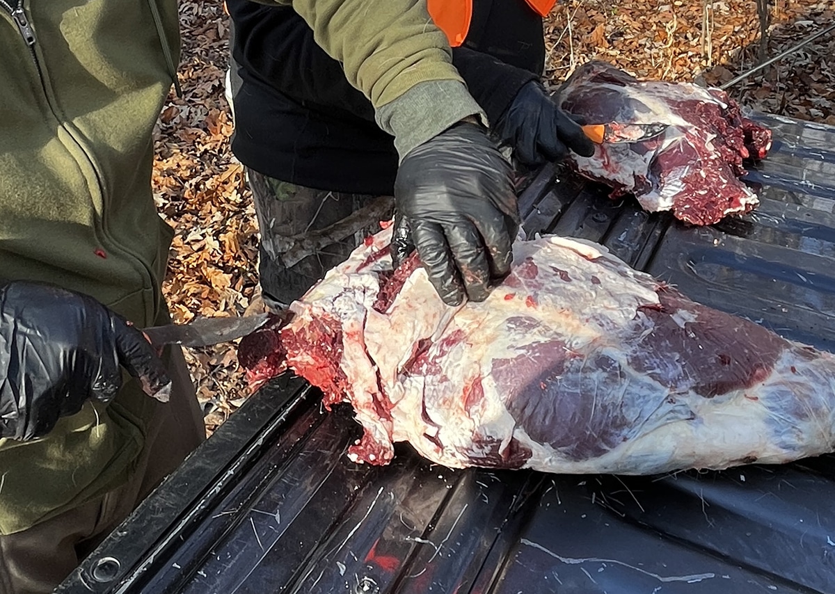 Disposable gloves are not only important for avoiding venison contamination, they also protect your health. Small cuts and abrasions on your hands can become infected with bacteria from tarsal glands and other parts of the deer. Wear gloves if possible, and change to a fresh pair often as you work, especially if you cut through them or they break.