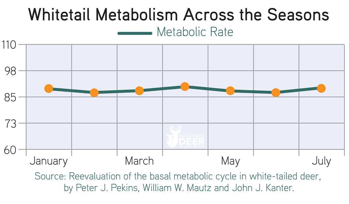 Scientists started working on white-tailed deer energetics in the 1950s. In 1969 and 1973, they reported winter metabolic rates that were 80 to 116% lower than summer rates. However, the scientists who conducted these early studies didn’t account for deer activity in the metabolic chamber, and they incorrectly assumed the activity wouldn’t skew the calculations. Since the winter rate was much lower than the summer metabolic rate, biologists started referring to a much-reduced winter metabolism and suggested it was a winter survival strategy.